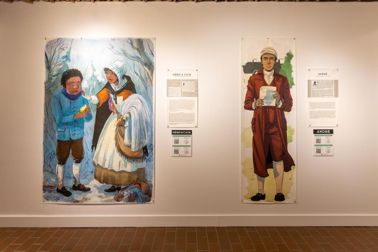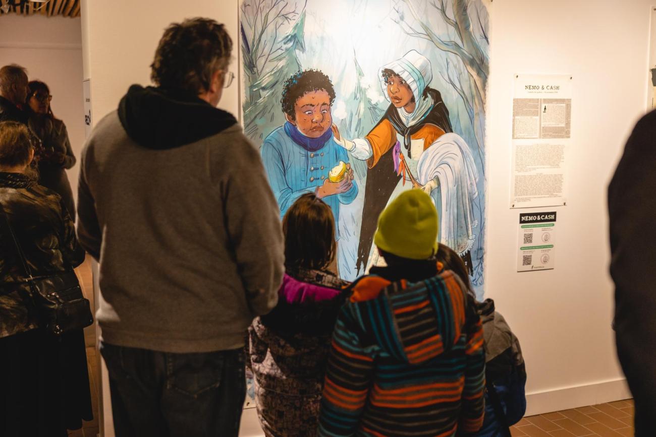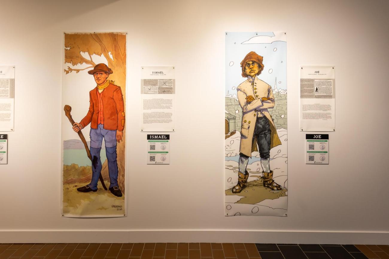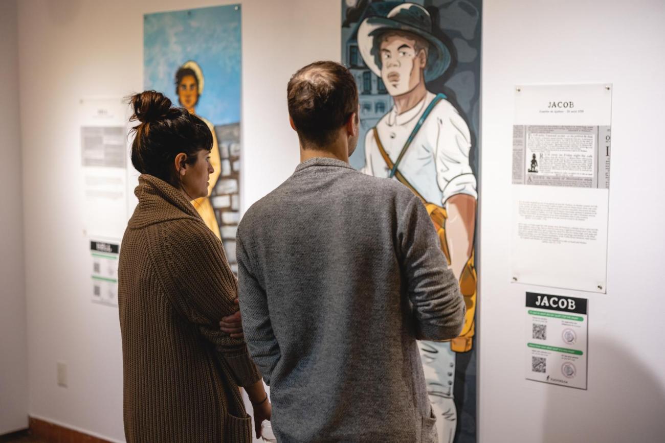 Présentant la résistance des personnes Afrodescendantes asservies au Québec, Fugitifs! est une exposition ayant pour but de réhumaniser des personnes invisibilisées. Basée sur 10 annonces de journaux de la seconde moitié du 18e siècle, l’exposition illustre 13 esclaves ayant pris la fuite. Les dessins grandeur nature, réalisés par neuf illustrateur.trices québécois.es permettent de redonner un visage à des gens déshumanisés par la servitude et, par le fait même, de démontrer la résistance à cette pratique dans des conditions ne favorisant pas la rébellion armée vu leur faible nombre.