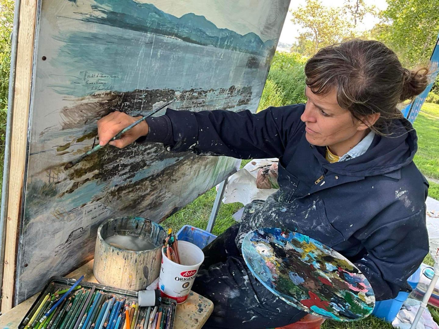 Suite aux ateliers, plus de 260 personnes ont eu la chance d’observer l’artiste à l’œuvre en direct dans le paysage duquel s’inspirait le tableau en devenir. La responsable de la médiation culturelle était sur place pour discuter avec les gens afin de leur présenter la démarche de l’artiste et les détails du projet Fleuve à colorier.